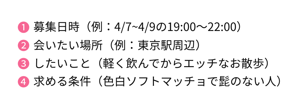 以下の❶~❹を『運営メッセージ』で送ってね!(チャットを開くと「マッチン運営事務局」があります)